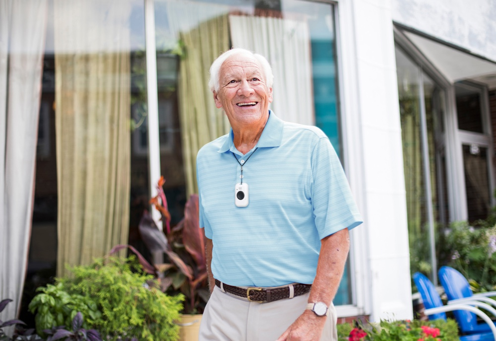 Man in blue shirt, smiling, enjoying a walk down the street with CoxHealth Lifeline securely hanging on a lanyard around his neck